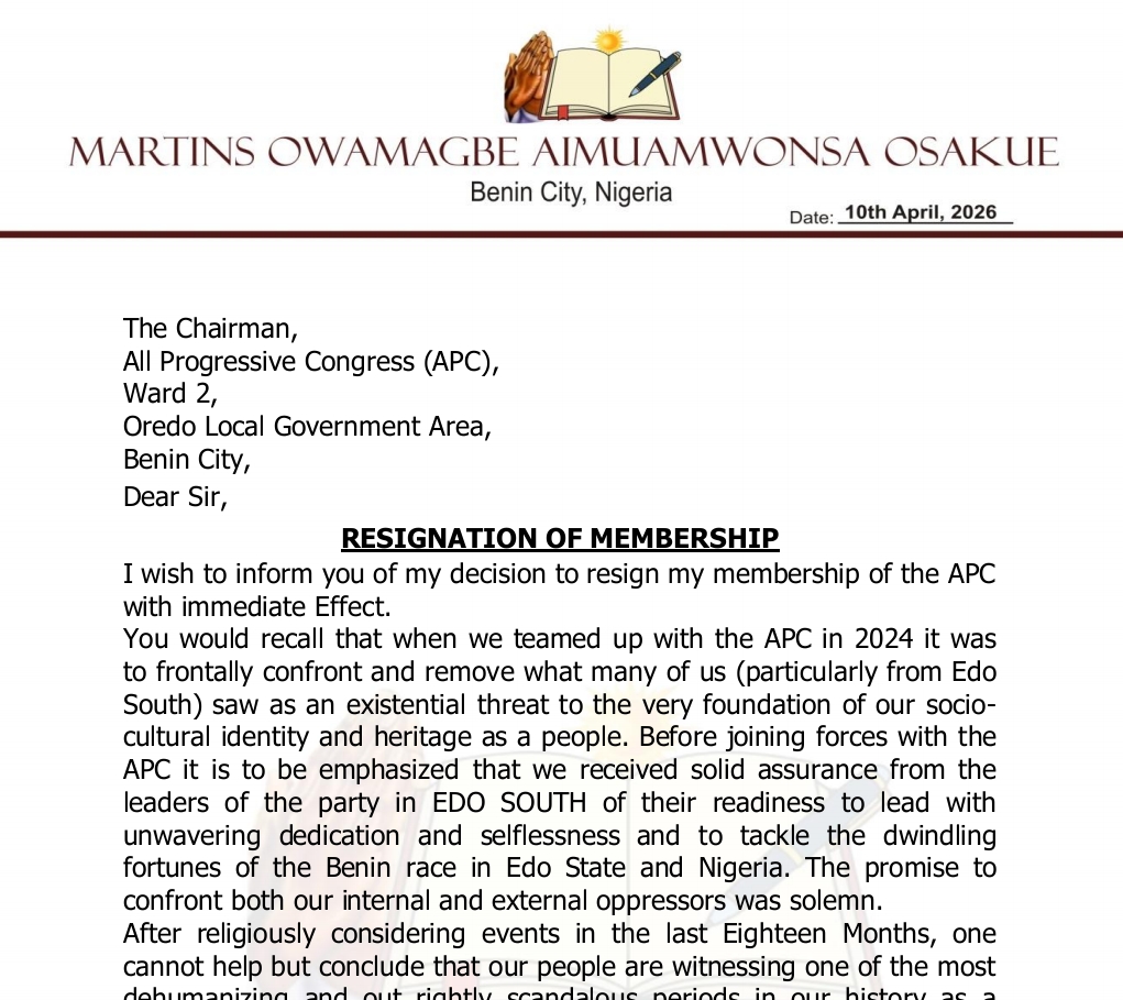 In a resignation letter addressed to the ward chairman, the party member announced his decision to leave the APC with immediate effect, recalling that his decision to join the party in 2024 was driven by a collective desire to confront what was perceived as an “existential threat” to the sociocultural identity and heritage of the Benin people.