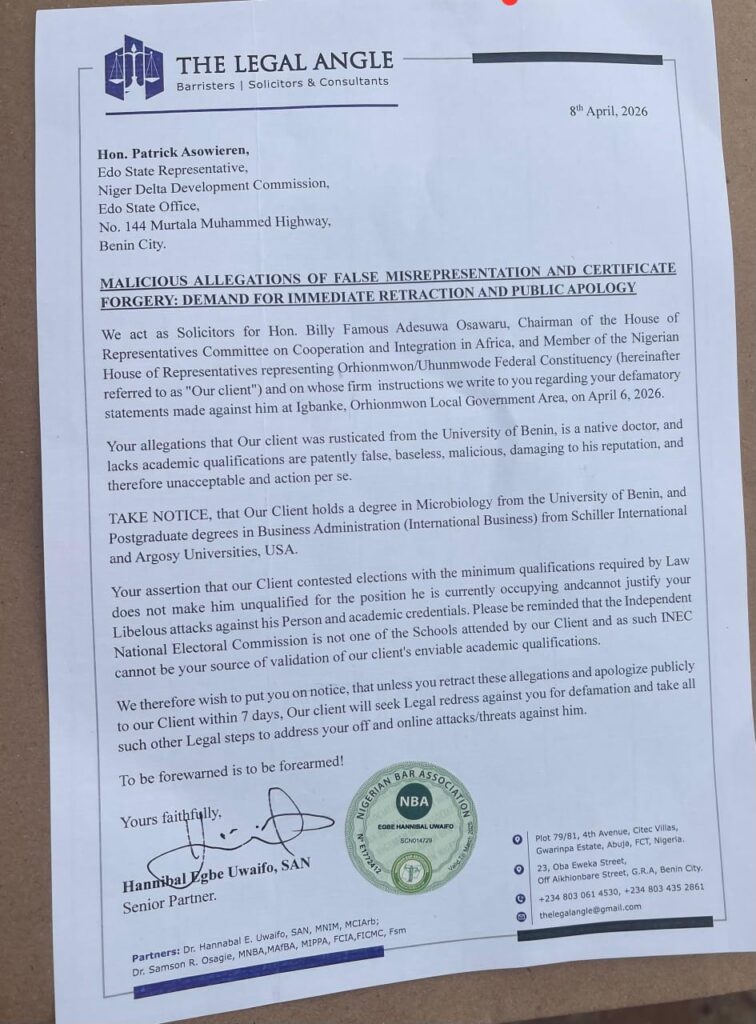 The law firm of Hannibal Egbe Uwaifo, acting on behalf of Billy Famous Adesuwa Osawaru, has issued a formal demand to Patrick Asowieren, calling for an immediate retraction and public apology over statements made on April 6, 2026.