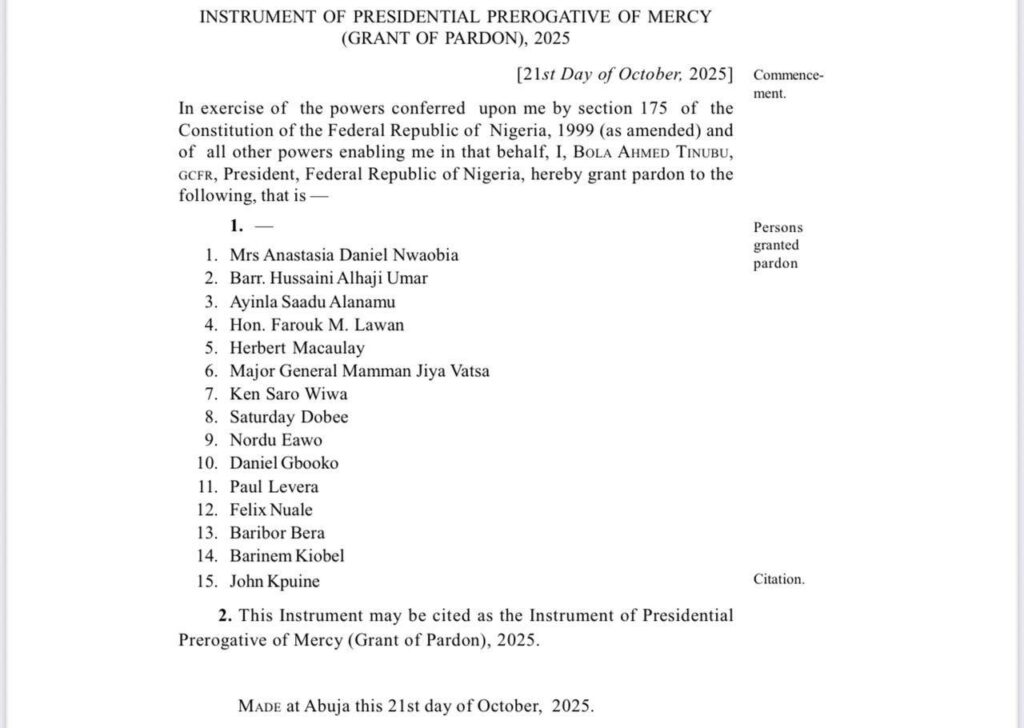 “President Bola Ahmed Tinubu, GCFR, has executed the relevant instruments of release to complete the process of formally exercising his constitutional power of prerogative of mercy to grant pardon and clemency to specific individuals who were earlier convicted for various offences.